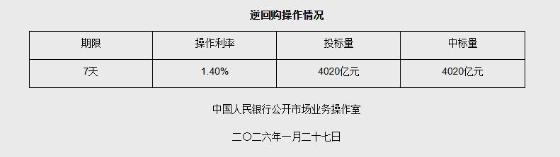 据央行网站消息,2026年1月27日中国人民银行以固定利率、数量招标方式开展了4020亿元7天期逆回购操作。具体情况如下: