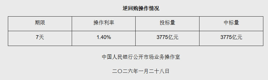 发布时间:2026-01-28 浏览: 次 作者:admin 据央行网站消息,2026年1月28日中国人民银行以固定利率、数量招标方式开展了3775亿元7天期逆回购操作。具体情况如下: 图片来源:央行网站截图