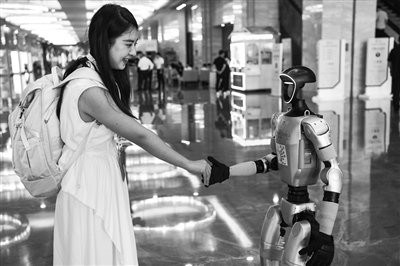 在2025中国国际大数据产业博览会开幕式现场,参会人员与一款机器人互动。新华社记者 杨文斌 摄
