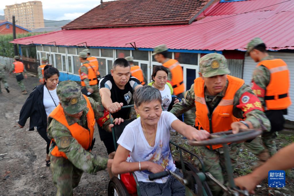 8月5日,陆军第78集团军某旅官兵在黑龙江五常市沙河子镇某养老院转移受困老人。新华社发(王麒淞 摄)