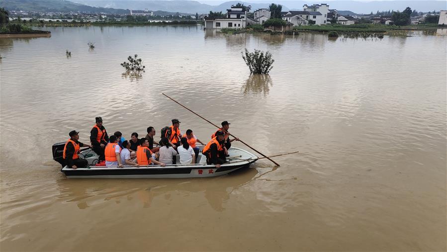 7月6日,武警安徽省总队黄山支队官兵驾驶冲锋舟在黄山区转移受困群众。新华社发(周磊 摄)