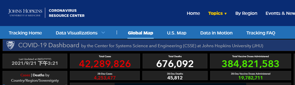 根据美国约翰斯·霍普金斯大学提供的数据,截至北京时间今天(9月21日)下午3时21分,美国新冠肺炎累计确诊病例42289826例,累计死亡病例超过67.6万,达到676092例。
