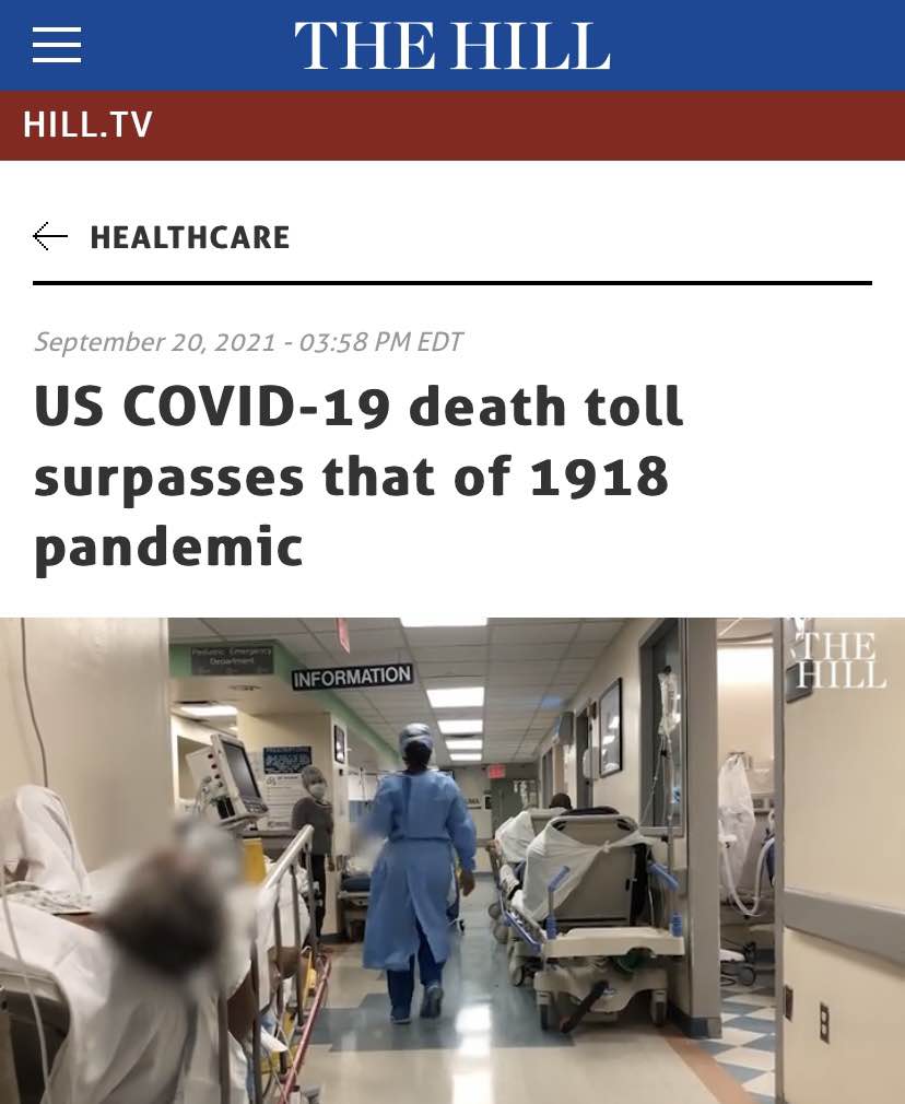 美国《国会山报》当地时间9月20日报道说,尽管在过去的103年,科学和医学都取得了巨大进步,在美国,因新冠肺炎疫情死亡的人数仍超过了1918年至1919年大流感疫情所造成的死亡人数——67.5万人。