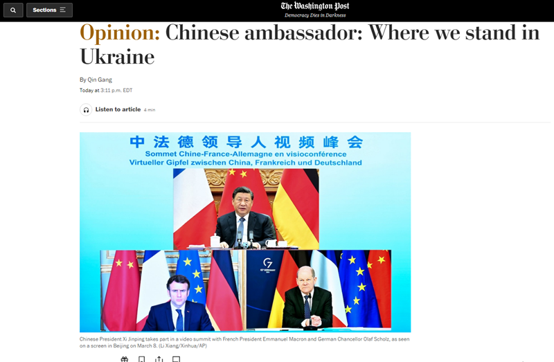 ¡¡¡¡2022Äê3ÔÂ15ÈÕ£¬×¤ÃÀ¹ú´óÊ¹ÇØ¸ÕÔÚ¡¶»ªÊ¢¶ÙÓʱ¨¡··¢±íÌâΪ¡¶ÎÒÃÇÔÚÎÚ¿ËÀ¼ÎÊÌâÉϵÄÁ¢³¡¡·µÄÊðÃûÎÄÕ¡£È«ÎÄÒëÎÄÈçÏ£º