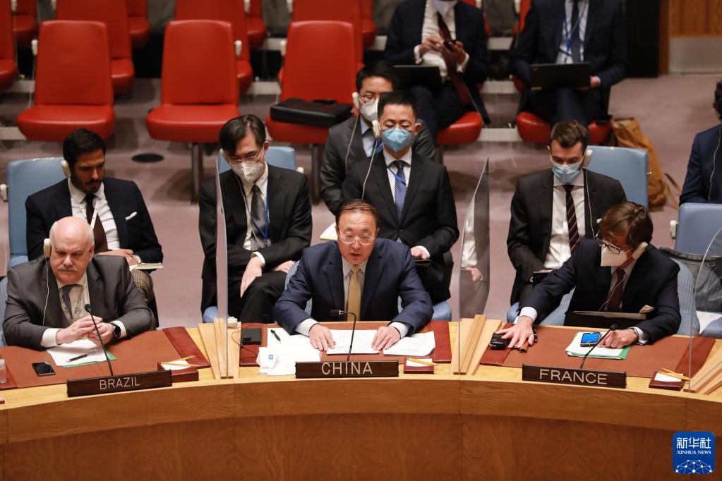3月18日,在位于纽约的联合国总部,中国常驻联合国代表张军(前排中)在安理会审议乌克兰生物安全问题时发言。新华社记者 谢锷 摄