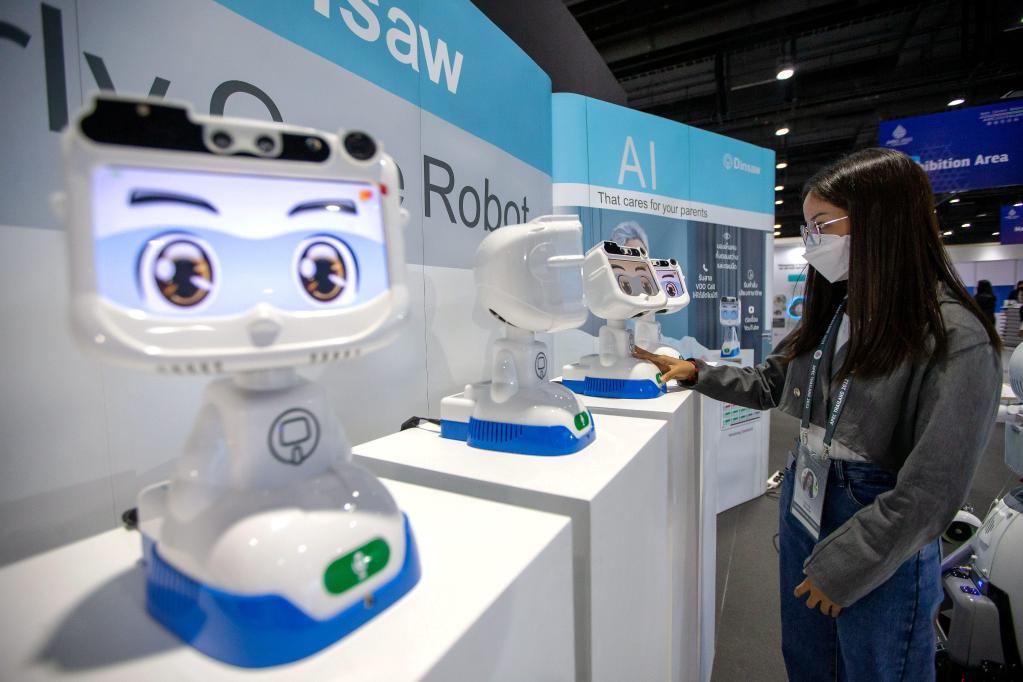 11月14日,在泰国首都曼谷,工作人员在APEC会议媒体中心与机器人互动。(新华社记者王腾摄)