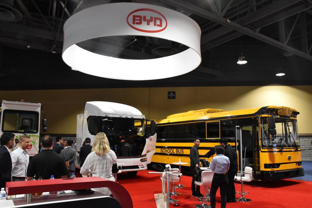 2022年5月10日,人们在美国加利福尼亚州长滩市举行的2022年先进清洁运输博览会上参观比亚迪展区。新华社发(曾慧摄)