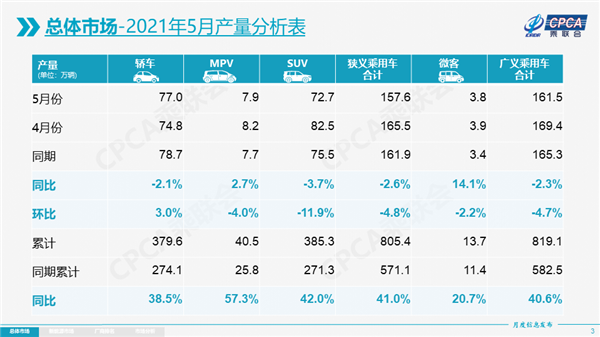 新能源依旧呈现强势增长态势,5月,新能源乘用车批发量达到19.6万辆,环比增长6.7%,同比增长174.2%。综合市场表现强劲,以及未来需求依旧旺盛等因素考量,乘联会将2021年新能源车批发量预期提升至240万辆。