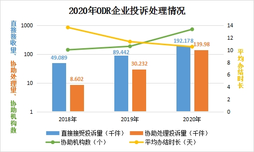 2020年,市场监管部门大力推进在线纠纷和解机制建设,努力把消费纠纷化解在源头、解决在基层、和解在企业。全国12315平台共发展ODR企业2.55万家,主动与消费者协商纠纷19.22万件,与传统调解方式相比,和解率高出6.21个百分点,平均处理时长缩短7.76天,消费者满意度4.07分(满分5分),ODR城市覆盖率由25.60%增加到91.11%。与2019年相比,2020年ODR机制运行质量有了明显提高,投诉处理量、办理效率、和解成功率、消费者满意度等各方面均有明显提升,维权效能日益突显。