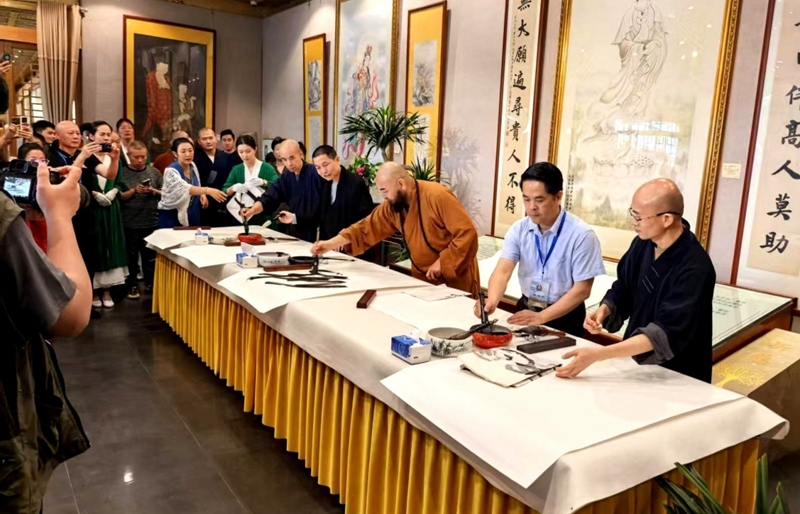 开幕式上,卢一先生与东华禅寺开山方丈万行大和尚、特邀艺术家涂泽寰先生、黎方强先生及寺院法师们共同挥毫,创作多幅作品(下图)。