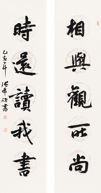 综观其书,整体布局严谨,结字交代清楚,其楷书工整端丽,圆韵丰满;行草结体就各自的特定的字形、字势作整体的变形和局部的移位,以突破传统的一般化处理,从而富有清新、生动的美感意趣,体现了书家幽默风趣、诙谐的个性情趣及敏锐的现代审美意识。不仅有欧字、赵字的流韵之笔,而且有颠张醉素的飘逸之韵。真正是古拙而不失灵秀,端庄而不失俊俏。尽而彰显了其鲜明个性的大家风范!