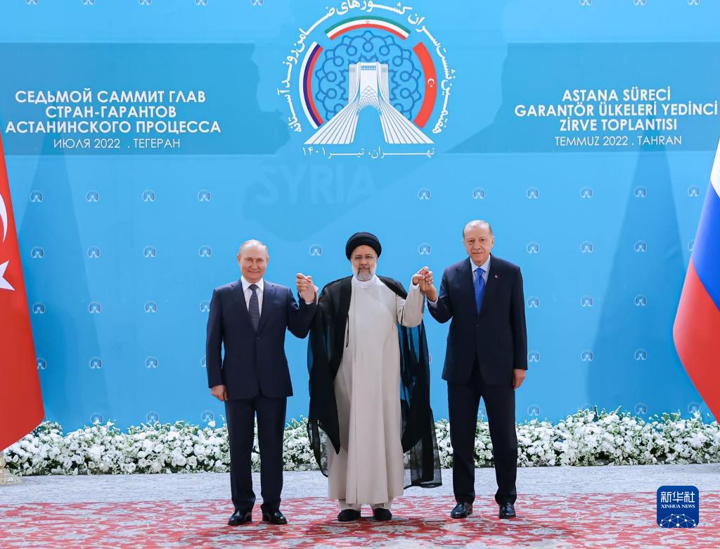 7月19日,在伊朗首都德黑兰,伊朗总统莱希(中)、俄罗斯总统普京(左)和土耳其总统埃尔多安在会谈前合影。新华社发(伊朗总统网站供图)