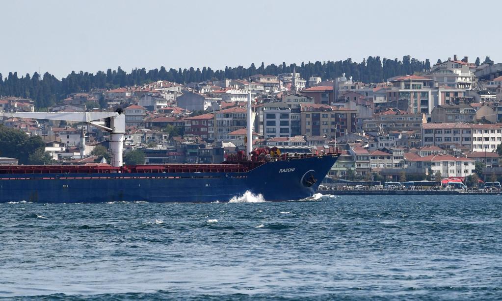 8月3日,从乌克兰敖德萨港出发的首艘运粮船“拉佐尼”号经过位于土耳其伊斯坦布尔的博斯普鲁斯海峡。新华社记者沙达提摄