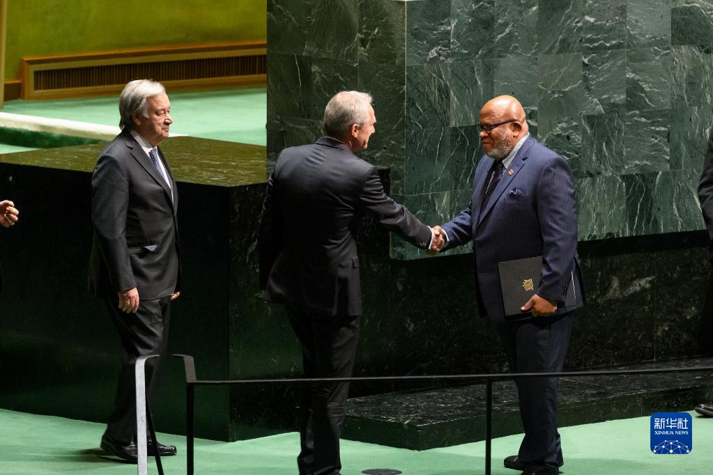 6月1日,在位于纽约的联合国总部,特立尼达和多巴哥常驻联合国代表丹尼斯·弗朗西斯(右)当选第78届联合国大会主席后与第77届联大主席克勒希握手。新华社发(联合国供图/洛伊·费利普摄)