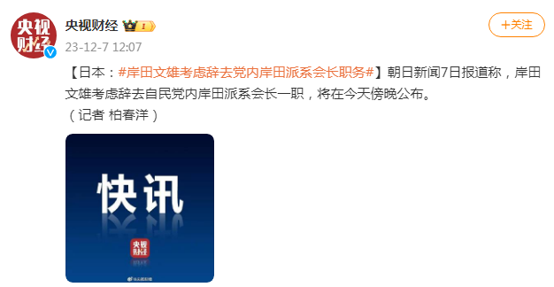 朝日新闻7日报道称,岸田文雄考虑辞去自民党内岸田派系会长一职,将在今天傍晚公布。(记者 柏春洋)