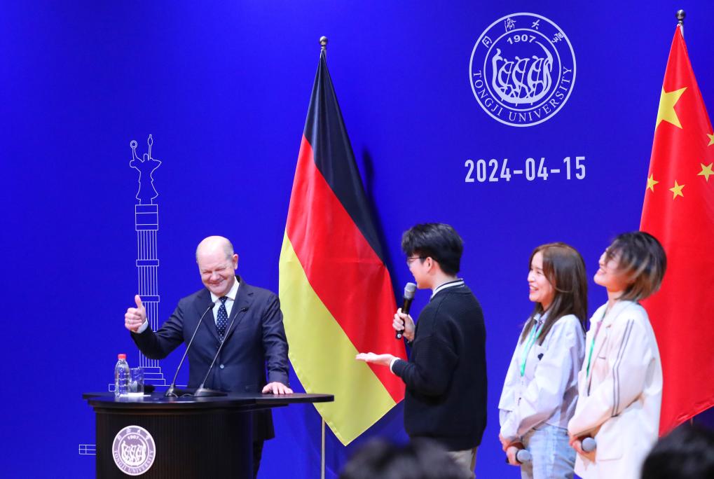 4月15日,德国总理朔尔茨(左)在同济大学嘉定校区与学生进行交流。新华社记者方喆 摄