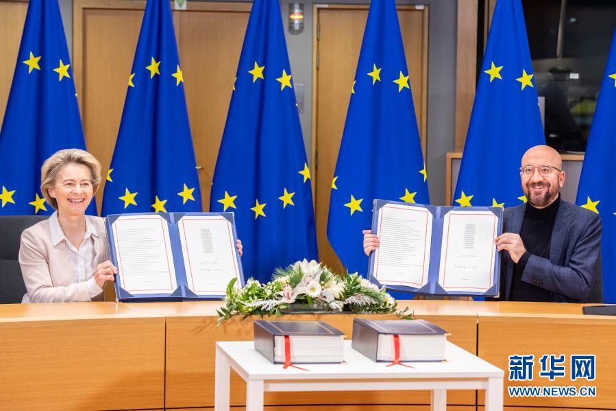 12月30日,在比利时布鲁塞尔的欧盟总部,欧洲理事会主席米歇尔(右)和欧盟委员会主席冯德莱恩(左)出席签署仪式。新华社发(欧盟供图)