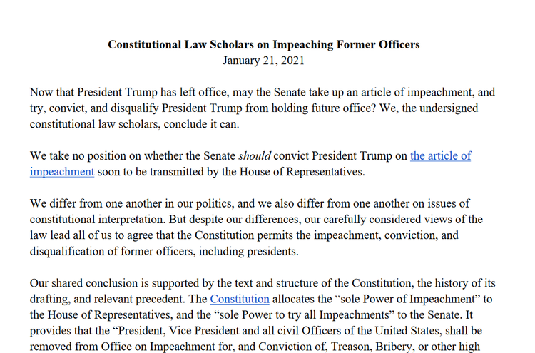 在美国宪法中,弹劾案的裁决最多只限于免职,以及取消担任公职的资格,两个内容之间的英文单词是“and”(和)。哥伦比亚大学法学院研究弹劾案的教授菲利普·博比特(Philip Bobbitt)的解读是,对特朗普的弹劾罢免是参议院继续裁定剥夺其担任公职的先决条件,既然特朗普已经离任,参议院无法罢免他,继续弹劾案的审理就是不合理的。博比特的观点也得到了哈佛大学法学院教授阿兰·德绍维茨(Alan Dershowitz)的支持,他同时也是2019年12月特朗普弹劾案的辩护律师,他认为参议院只能对在位的总统进行弹劾案审理。